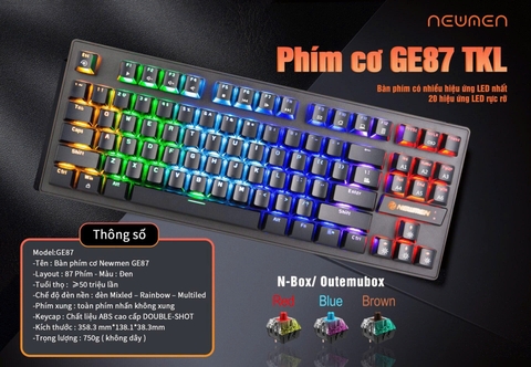 Bàn phím cơ nhỏ gọn, Layout 87 nút, Keycap ABS Double-shot chất lượng cao với hiệu ứng ánh sáng xuyên Led rực rỡ, Keycap OEM Profile quen thuộc dễ Typing, cấu trúc keycap dạng treo dễ dàng vệ sinh, dây Nylon bện chống đứt chống gẫy bập bền bỉ với 3 hướng đi dây gọn gàng, USB mạ vàng chống nhiễu, 20 hiệu ứng ánh sáng tuyệt đẹp cài đặt sẵn, đổi mới mỗi lúc cho không gian làm việc thêm thú vị. Bàn phím nhỏ gọn, chi phí thấp nhưng được tích hợp rất nhiều tính năng thú vị như Multimedia, Marco rất hữu ích cho trải nghiệm thú vị. Swich bền bỉ N-Box được Newmen tùy chỉnh, chống bụi bền bỉ hơn, cảm giác gõ phím tốt hơn.