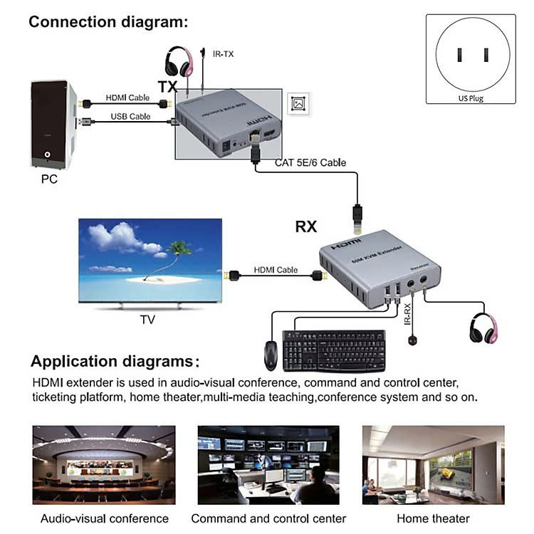 Tình huống ứng dụng: Bộ mở rộng cáp HDMI chủ yếu được sử dụng trong các hội nghị nghe nhìn, trung tâm chỉ huy và điều khiển, nền tảng bán vé, rạp hát gia đình, giảng dạy đa phương tiện, hệ thống hội nghị ,