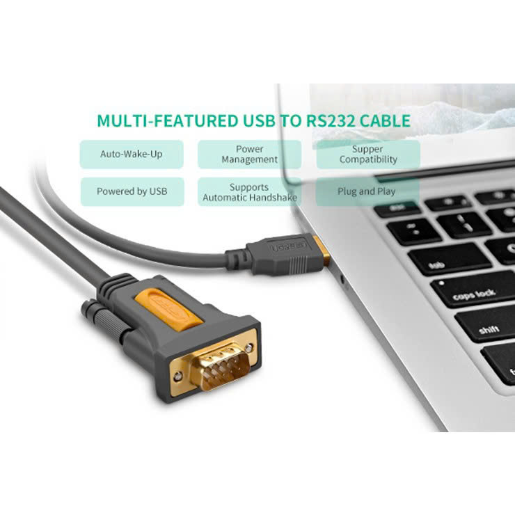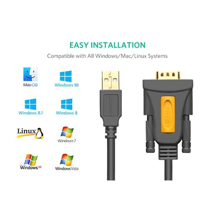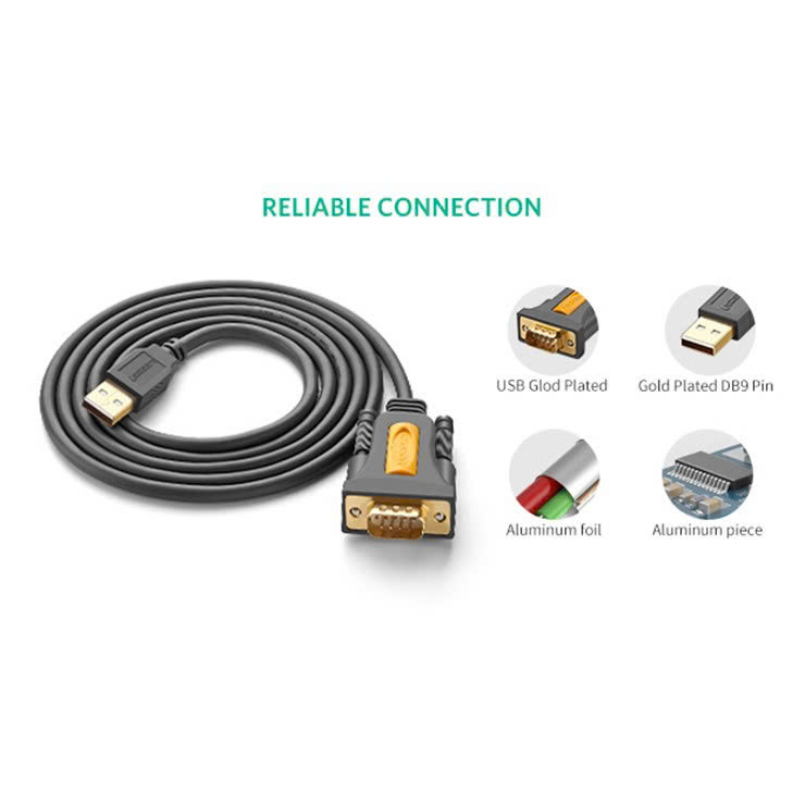 - • Cáp USB to Com dài 1,5m Ugreen 20211 cho phép người dùng máy tính thêm một cổng nối tiếp thêm cho các kết nối RS-232 sử dụng USB.