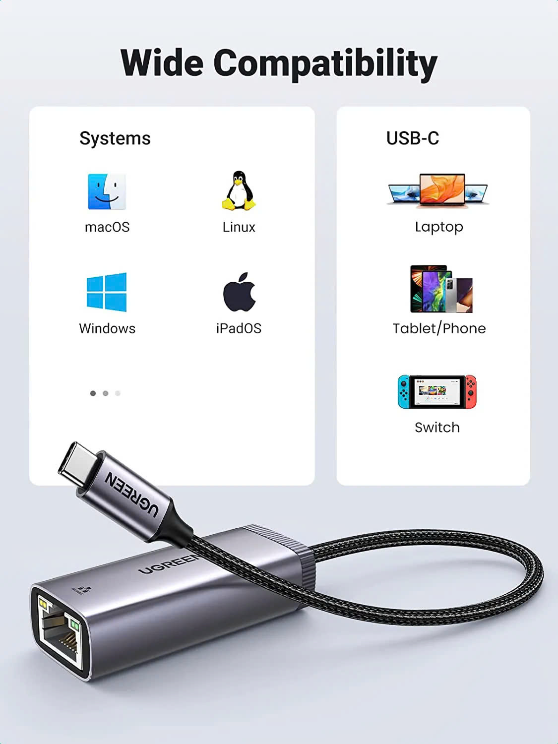 UGREEN 40322 USB-C to LAN Adapter tương thích với hầu hết các thiết bị USB-C và Thunderbolt 3. Đây là phần mềm miễn phí trình điều khiển trên Windows 10 / 8.1 / 8, . (Một số kiểu máy Android có thể không được hỗ trợ.) Nó yêu cầu cài đặt trình điều khiển trên Windows XP / 7 / Vista và Linux, có thể dễ dàng cài đặt theo hướng dẫn của chúng tôi.