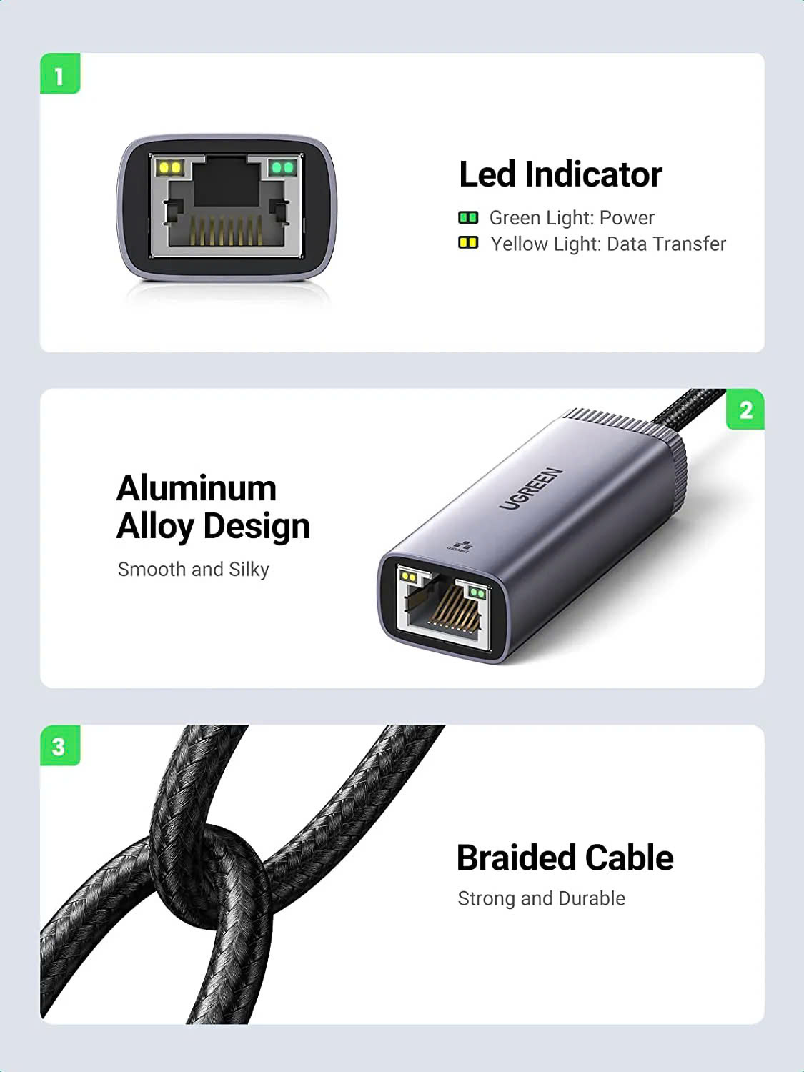 Cáp chuyển USB Type C sang mạng Lan, RJ 45 Ugreen 40322 tốc độ 1Gb/1000Mb màu ghi vỏ nhôm to RJ45 này sử dụng thiết kế vỏ nhôm mới, không chỉ đẹp và thanh lịch mà còn chống bám vân tay và chống ăn mòn. Và thiết kế dây bện siêu bền cũng giúp nâng cao tuổi thọ của sản phẩm lên rất nhiều.