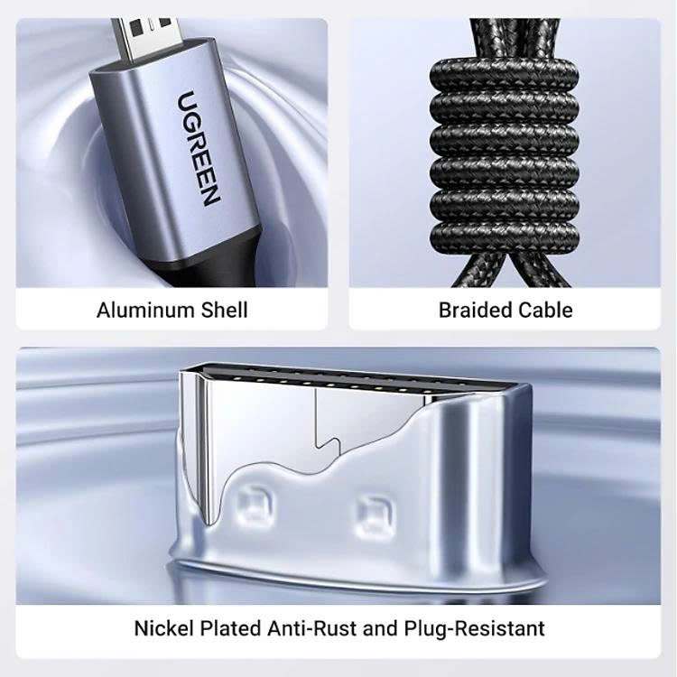 Ugreen 15517 có đầu bọc vỏ nhôm nâng cấp, kết cấu tốt hơn, tản nhiệt tốt hơn. Triple Tin Shielding giảm nhiễu. Đã thử nghiệm để được cắm bằng các đầu nối chống ăn mòn nhằm đảm bảo hình ảnh & âm thanh hàng đầu và đã rút phích cắm 25.000 lần và chặt chẽ không hề lỏng lẻo. Với dây bện nylon chất lượng cao, tính linh hoạt của cáp này ít gây áp lực lên ma sát của kết nối Micro HDMI tại máy ảnh.