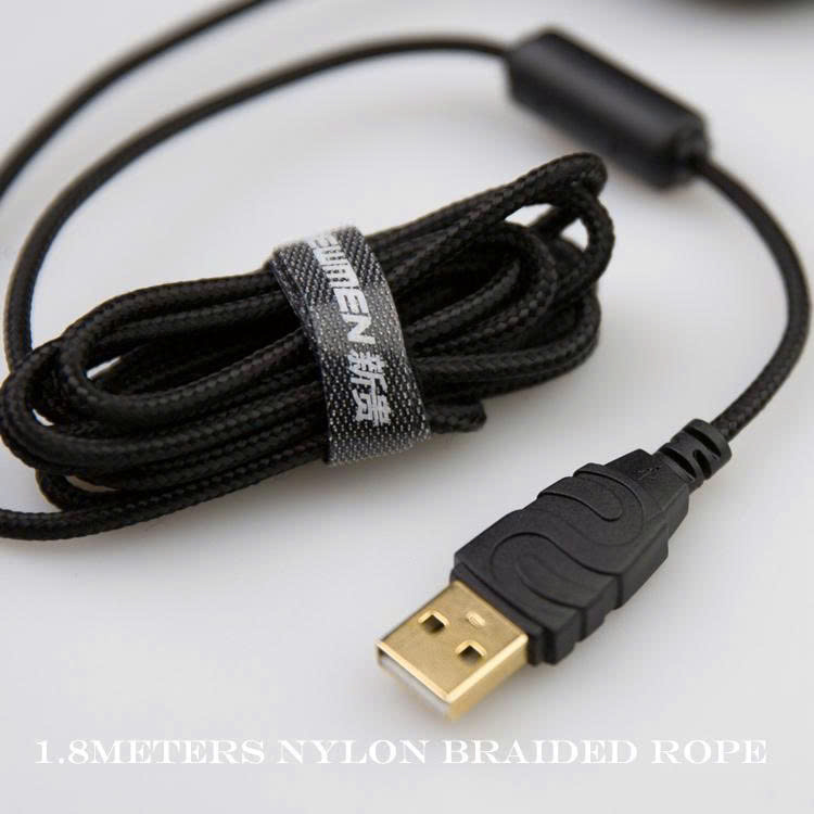 6/ Dây chống nhiễu điện từ: Dây bện nylon 1,8m, dây bọc 5 lõi cộng với vòng từ, kép chống nhiễu điện từ hiệu quả trong trường hợp chuột bị lỗi do nhiễu điện từ.