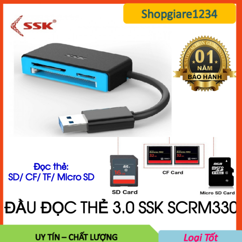 MÔ TẢ SẢN PHẨM - Đầu đọc thẻ nhớ đa năng USB3.0 SSK SCRM-330 *Hàng chính hãng SSK -------------------------- ♦ Mô tả: - Giao tiếp cổng USB 3.0 - Tốc độ truyền USB 3.0 lên đến 5 Gbps - Tương thích với USB 2.0 tốc độ truyền 480 Mbps - Hỗ trợ trực tiếp: CF / SD / MICRO SD / TF ♦ Thông số kỹ thuật: - Nhà sản xuất: SSK - Model: SCRM330 - Hỗ trợ: SD, MicroSD, CF type 1 - Đầu ra: USB 3.0 5 Gbps tốc độ cao - Chất liệu: Nhựa màu xanh đen --------------------------------------------------------------------