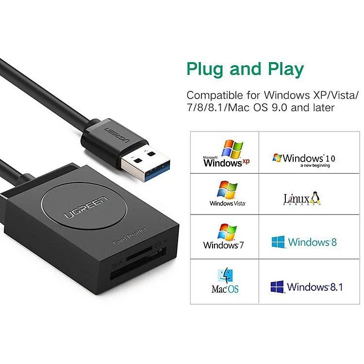 Đầu đọc thẻ Ugreen 20250 hỗ trợ thẻ nhớ: SD, SDHC, SDXC, Mini, Micro SD, Micro SDHC, T-Flash...