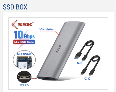 ox SSK Chuyển Đổi M2 NVMe To USB 3.1 Gen 2 HE-C370 (Có thể dùng cho SSD M2 SATA) là một thiết bị hỗ trợ người dùng kết nối ổ cứng SSD M2 PCIe (hay M2 SATA) với các thiết bị máy tính, laptop thông qua cổng kết nối USB 3.2 gen 2 thế hệ mới. Nếu bạn cũng đang quan tâm đến sản phẩm, hãy cùng LagiHitech tìm hiểu nó ngay sau đây qua bài viết này. Hỗ trợ giao diện USB 3.1 Gen 2 thế hệ mới Sản phẩm này được trang bị công kết nối USB 3.1 Gen 2 thế hệ mới, cung cấp tốc độ đọc ghi dữ liệu cực nhanh lên tới 1000MB/s. Quan trọng hơn cả là, nó còn có thể tương thích ngược với cả 2 chuẩn USB 2.0 và USB 1.1. Với SSD PCIe, nó hỗ trợ tốc độ tối đa 10Gbps. Còn với SSD M2 SATA, nó hỗ trợ tốc độ là 6Gbps. Thiết kế thời trang, hiện đại Box SSK Chuyển Đổi M2 NVMe To USB 3.1 Gen 2 HE-C370 (Có thể dùng cho SSD M2 SATA) được thiết kế với phần vỏ làm bằng hợp kim nhôm sang trọng. Tổng thể sản phẩm khá gọn nhẹ, tạo khả năng tản nhiệt cực kỳ tốt. Hoàn toàn phù hợp theo cũng bạn mỗi khi đi du lịch hay công tác. Đi kèm 2 cáp kết nối USB Type C tiện dụng Thiết bị này được trang bị sẵn 2 dây cáp kết nối USB A to C và USB C to C vô cùng tiện dụng để bạn có thể kết nối, truyền dữ liệu với nhiều thiết bị máy tính, laptop khác nhau vô cùng dễ dàng. Tương thích tốt với cả SSD M2 NVMe và SSD M2 SATA Sản phẩm này có thể tương thích tốt với những chiếc ổ cứng SSD dạng M2 (bao gồm cả M2 PCIe NVMe và M2 SATA) với nhiều chuẩn kích thước khác nhau như 2242, 2260, 2280. Tuy nhiên, nó sẽ không tương thích với SSD M2 PCIe AHCI, các thiết bị M2 PCIe khác như card Wifi hay thẻ nhớ, SSD mSATA hay các dạng SSD không phải M2. Tương thích với nhiều hệ điều hành khác nhau Box SSK Chuyển Đổi M2 NVMe To USB 3.1 Gen 2 HE-C370 (Có thể dùng cho SSD M2 SATA) có khả năng tương thích và sử dụng tốt trên nhiều hệ điều hành khác nhau. Cụ thể hơn: Windows: Yêu cầu từ Windows 7 trở lên. Mac OS: Yêu cầu từ phiên bản Mac OS 10.10.5 trở lên. Hệ điều hành Linux và Android. Khi bạn cắm box ổ cứng này vào máy tính hay điện thoại, đèn LED màu xanh làm sẽ được bật lên. Khi bạn đang sử dụng thiết bị để đọc ghi dữ liệu, đèn LED này sẽ nhấp nháy. Bộ sản phẩm gồm có 1 x Box SSK Chuyển Đổi M2 NVMe To USB 3.1 Gen 2 HE-C370 1 x cáp type C to USB 3.0 1 x cáp type C to type C