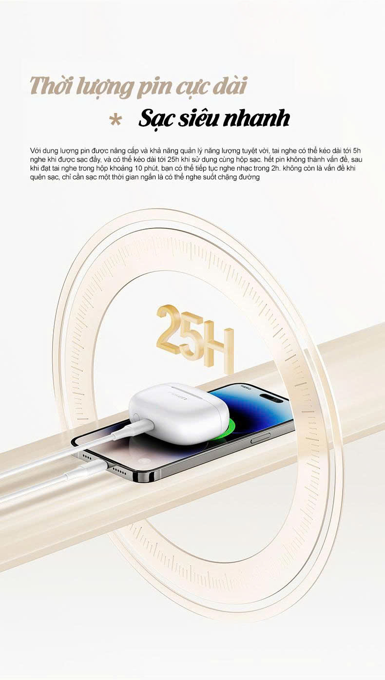 Tai nghe cho phép sử dụng liên tục 5 giờ, kết hợp với hộp sạc bổ sung thêm 25 giờ – tổng thời gian lên tới 30 giờ sử dụng. Dù bạn di chuyển cả ngày hay đi công tác, tai nghe vẫn luôn sẵn sàng.