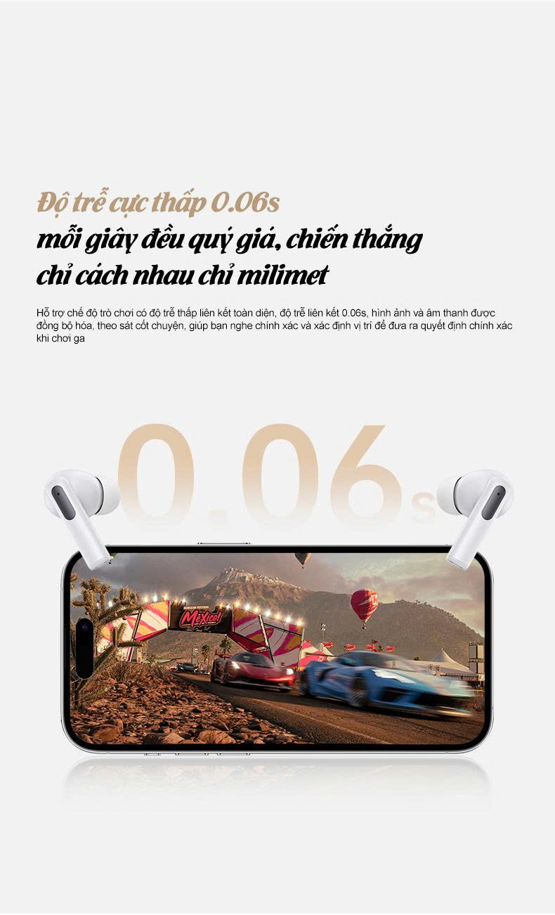 Chạm vào phím chức năng của bất kỳ tai nghe nào 4 lần để mở chế độ trò chơi, lặp lại thao tác để đóng.