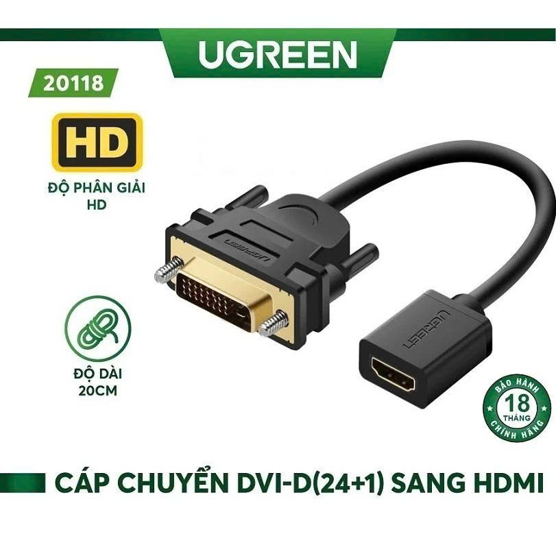Ugreen Cáp chuyển DVI 24+1 sang HDMI Ugreen 20118 dài 20cm màu đen nối từ máy tính card sang màn hình HDMI