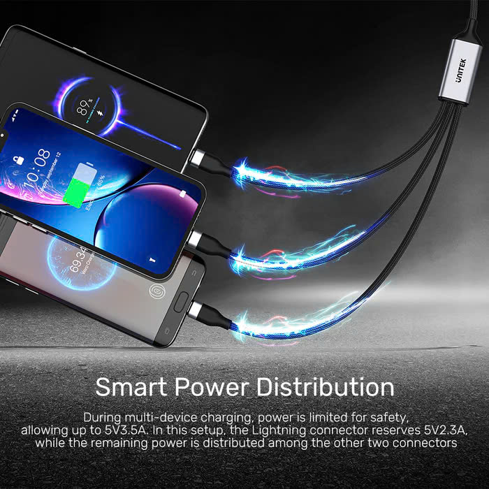 Cáp sạc USB-C 3 trong 1 UNITEK bao gồm các đầu nối Micro USB, USB-C và Lightning để có khả năng tương thích đa dạng. Cáp hỗ trợ sạc nhiều thiết bị với giới hạn nguồn điện an toàn, đảm bảo hiệu suất hiệu quả và đáng tin cậy.